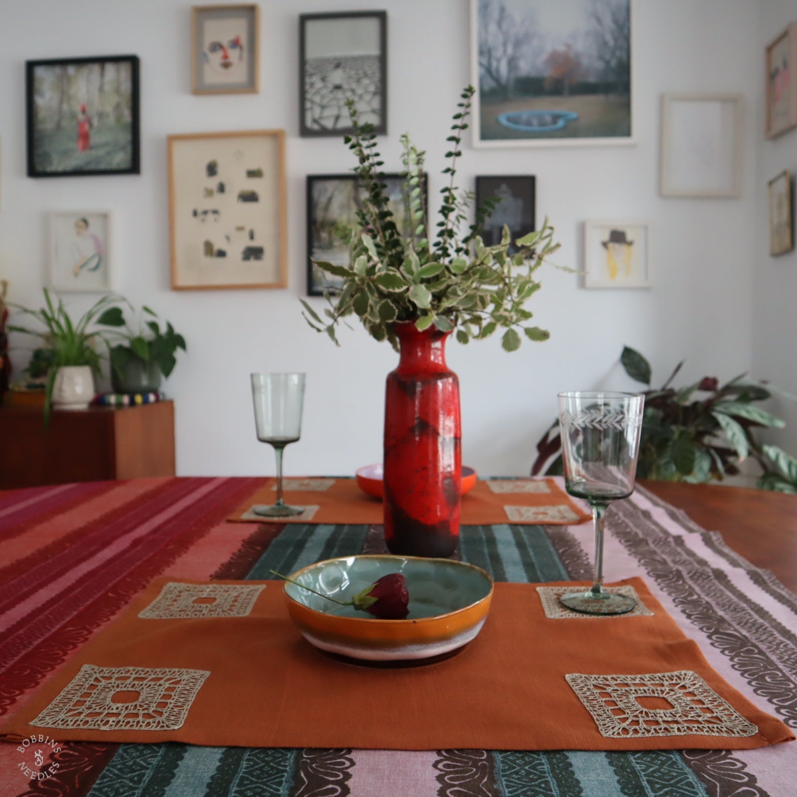 Colour at the table, where linen and antique lace come together. Joyful, everyday table settings made to be used and enjoyed.