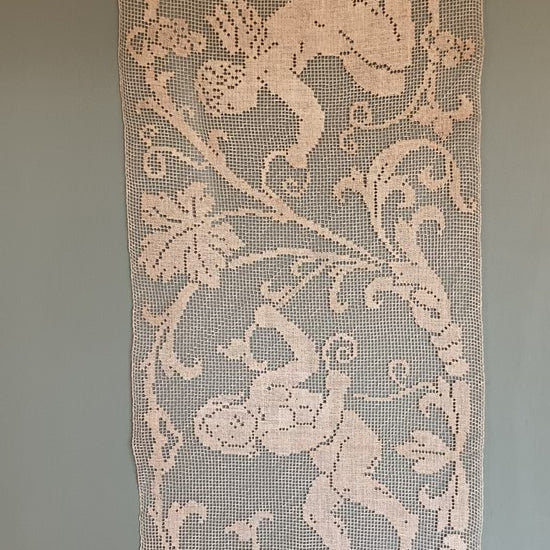 Handmade Filet Lace Panel with Putti and Cherub Motif – Antique European Linen Wall Hanging or Table Runner