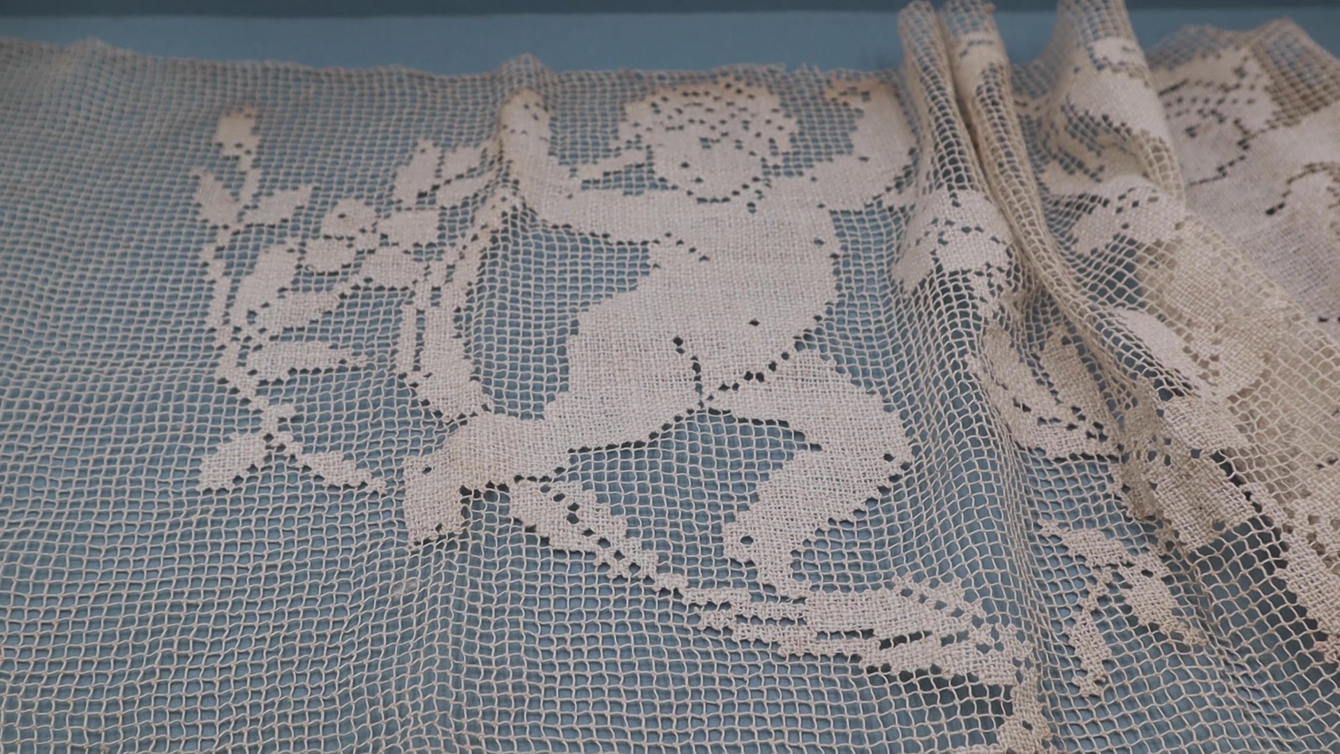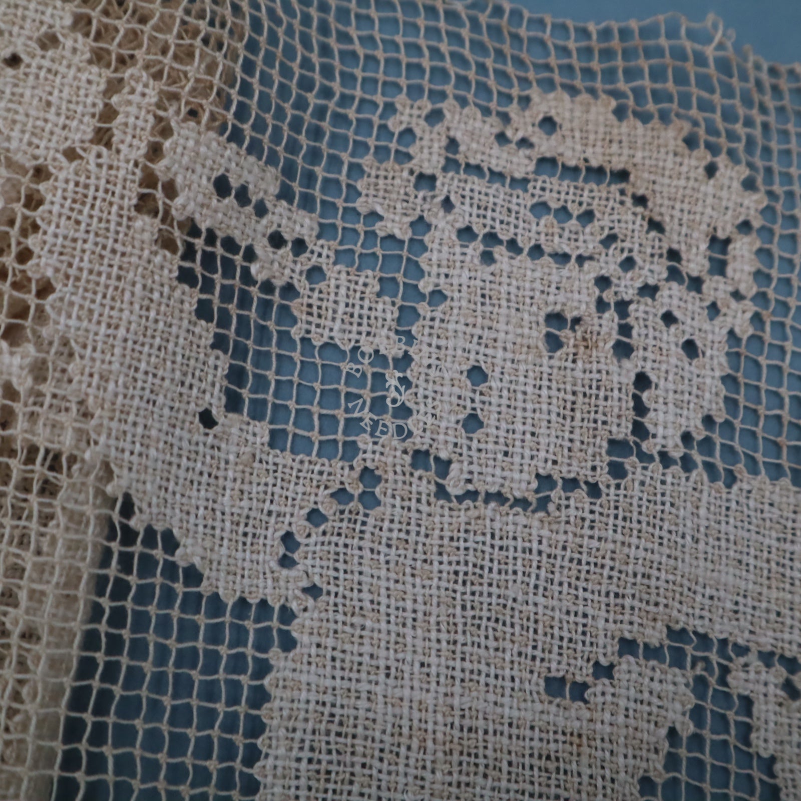 Crafted from natural linen thread using the traditional filet brodé (lacis) technique, where the net is entirely hand-made and the motifs are embroidered into the mesh.