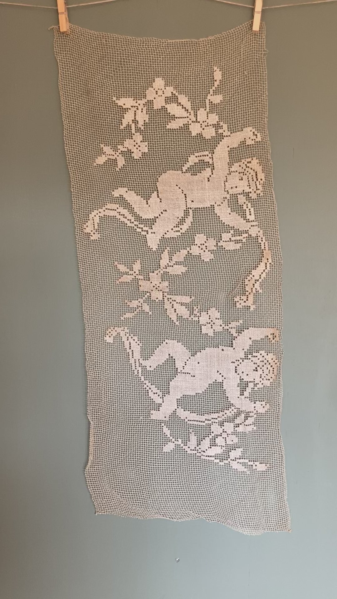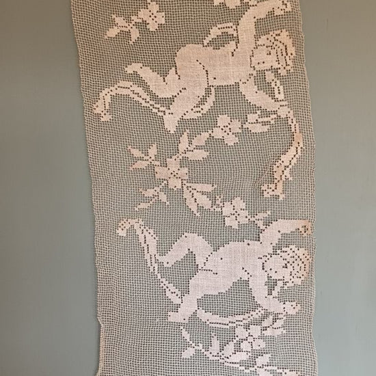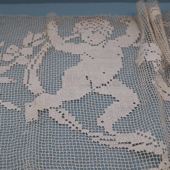 The lace panel was likely part of a larger decorative curtain or valance border. Its delicate design and classical subject make it ideal for framing, restoration, or textile collection.