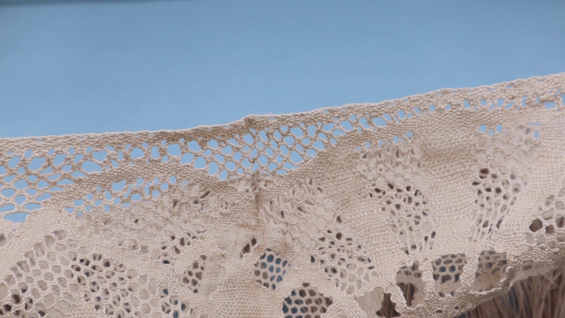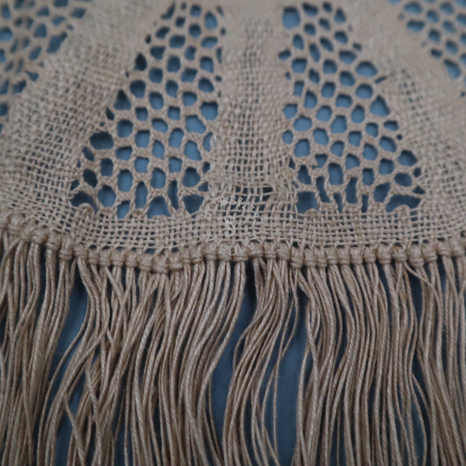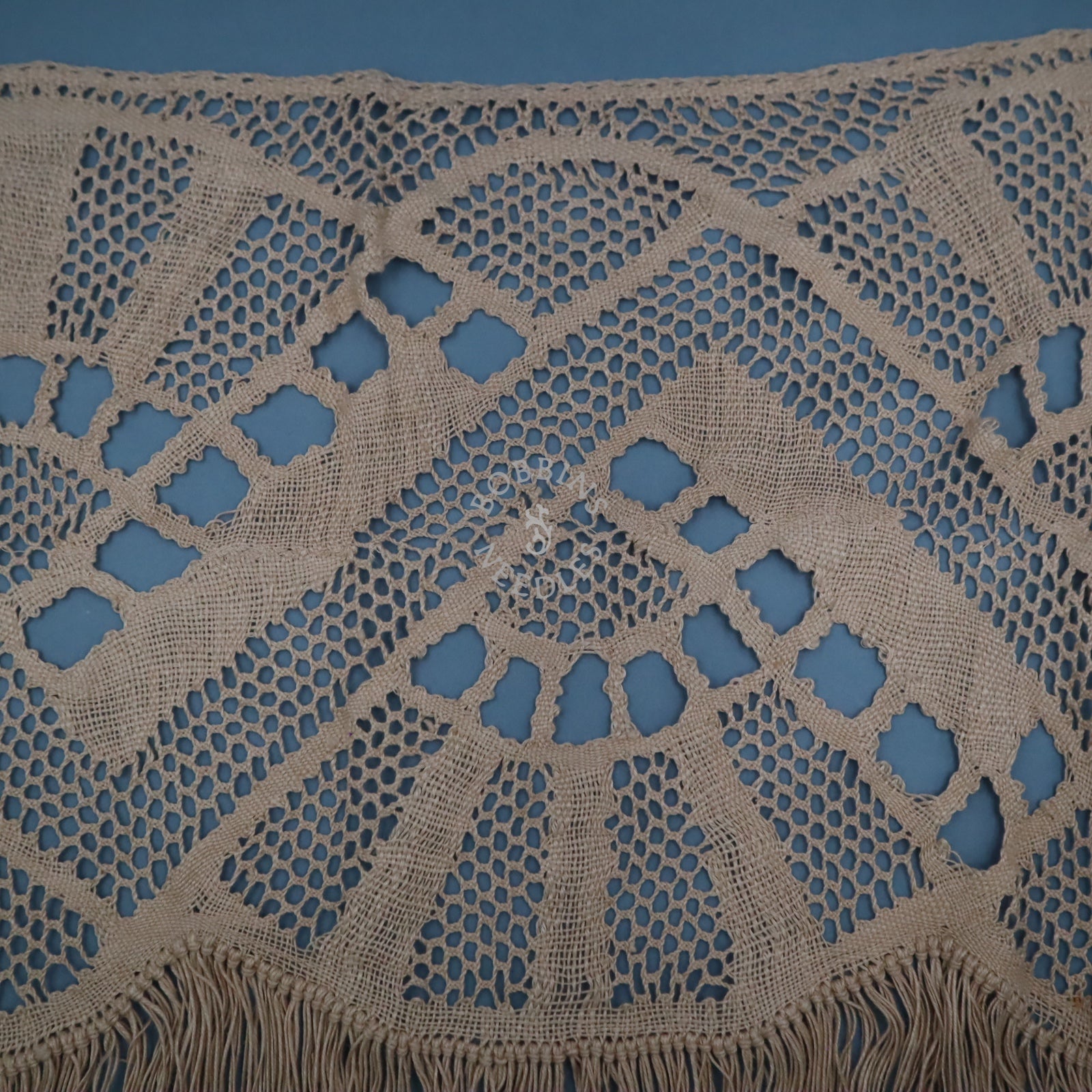This rectangular lace panel features a geometric openwork design and the lace is complemented by a long, hand-knotted fringe, which extends the piece’s total length.