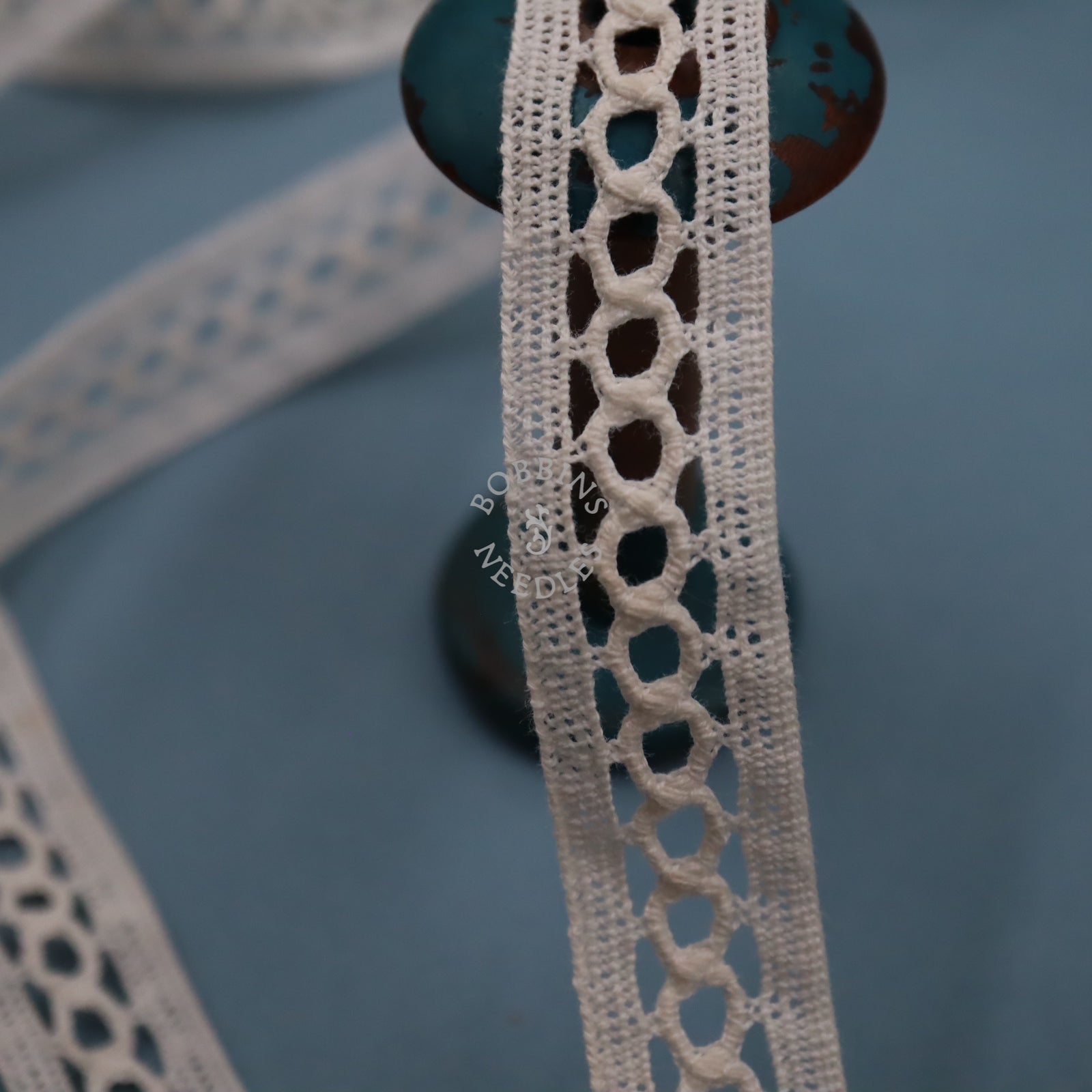 Introducing my French bobbin lace border. A vintage lace trim, made around the mid-part of the 20th century in the traditional bobbin lace-making region of Le Puy-en-Velay, Haute-Loire, France. Ensuring authenticity and quality, crafted from cotton, this insertion lace trim combines a soft feel with durability.