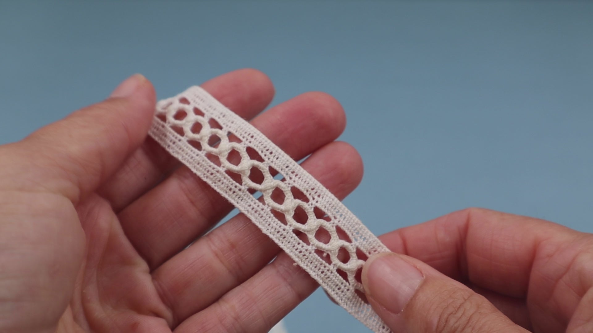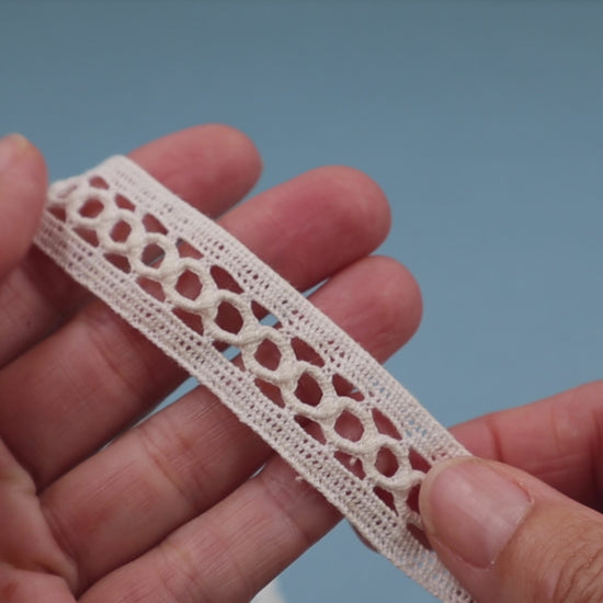 This lace features a geometric openwork pattern with oval motifs running through the center, bordered by fine woven edges for stability. The symmetrical structure and flat design make it easy to sew between fabrics or use as a joining lace in garments and textile projects.